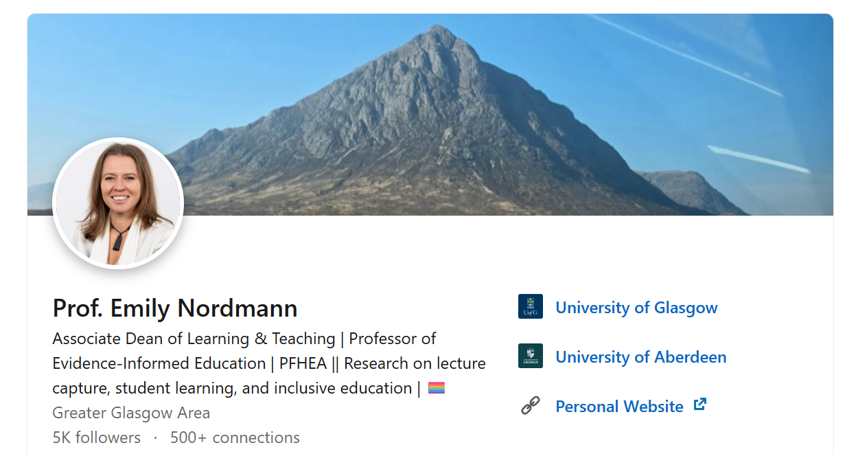 About I am Associate Dean for Learning and Teaching and Professor of Evidence-Informed Education at the University of Glasgow. My research predominantly focuses on lecture capture, how it can be used as an effective study tool by students and the impact on students from widening participation backgrounds as well as those with disabilities and neurodivergent conditions. In all my work, I draw on theories of learning from cognitive science and self-regulation, as well as theories of belonging and self-efficacy.
