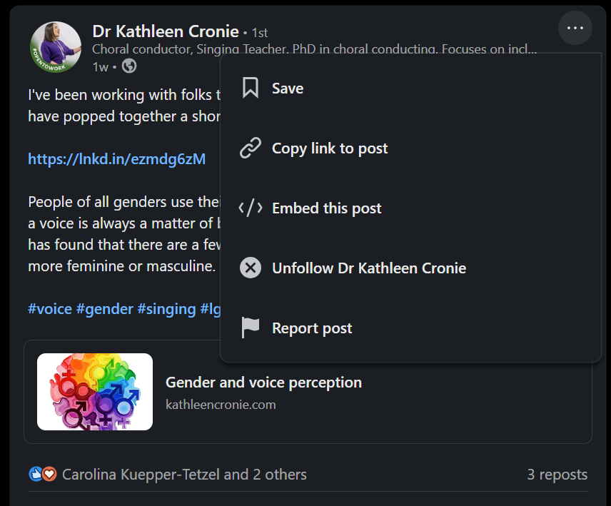 An annoying feature of LinkedIn is that in algorithmic view, it can sometimes be hard to find a post you have previously seen, unless you remember exactly who posted it. This is particularly annoying when the page refreshes without you asking it to. You can save posts by clicking the three dots at the top of the post then “Save”.