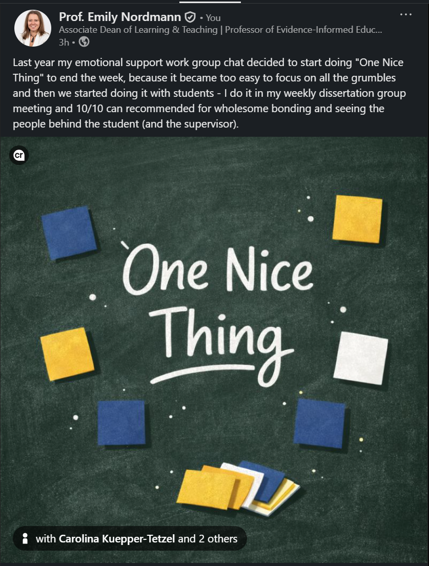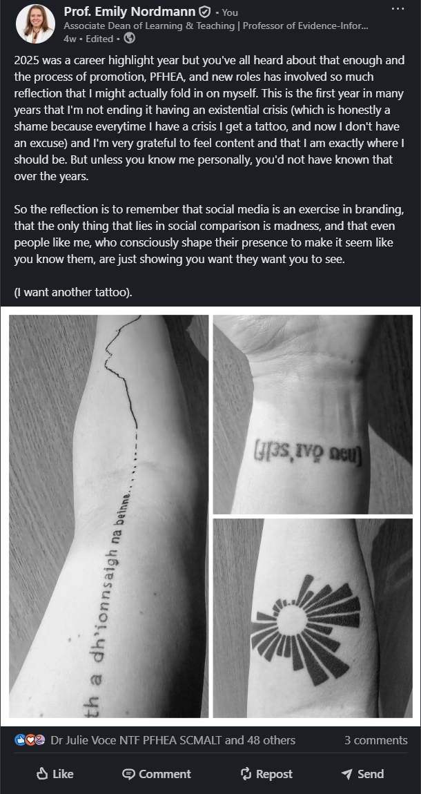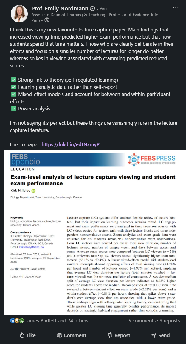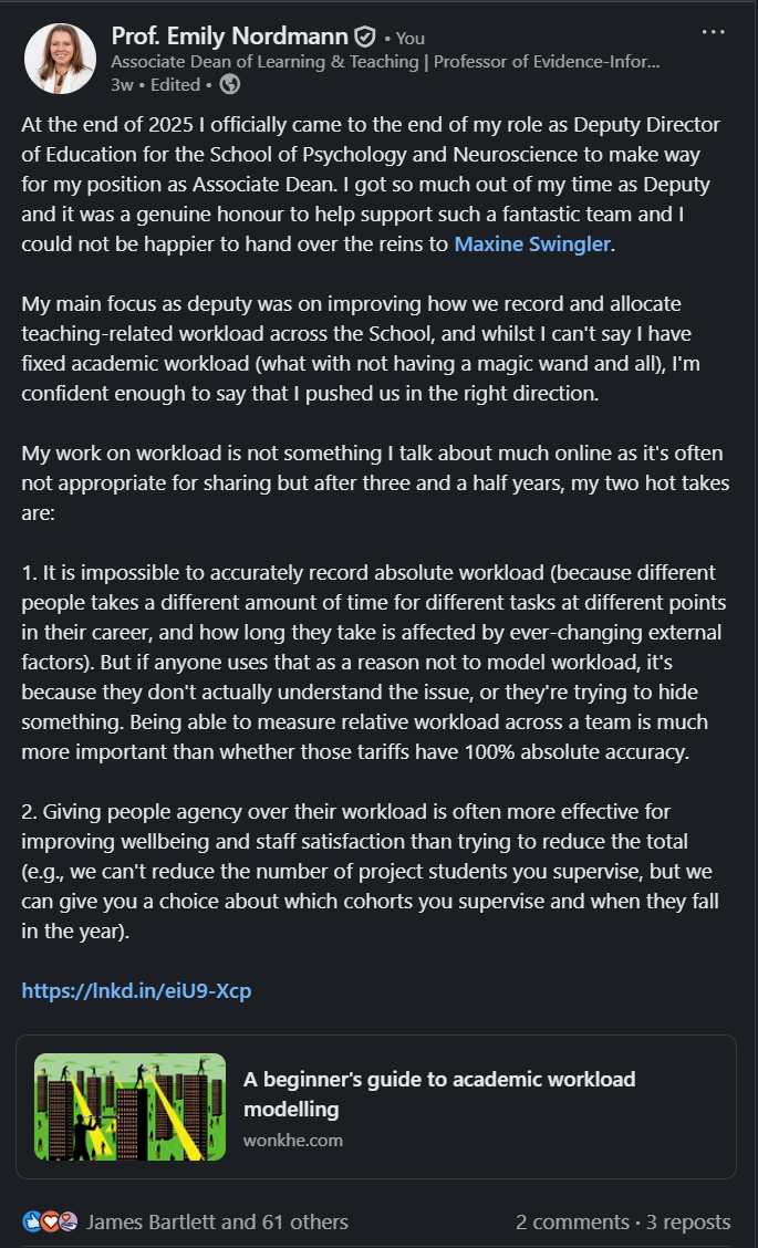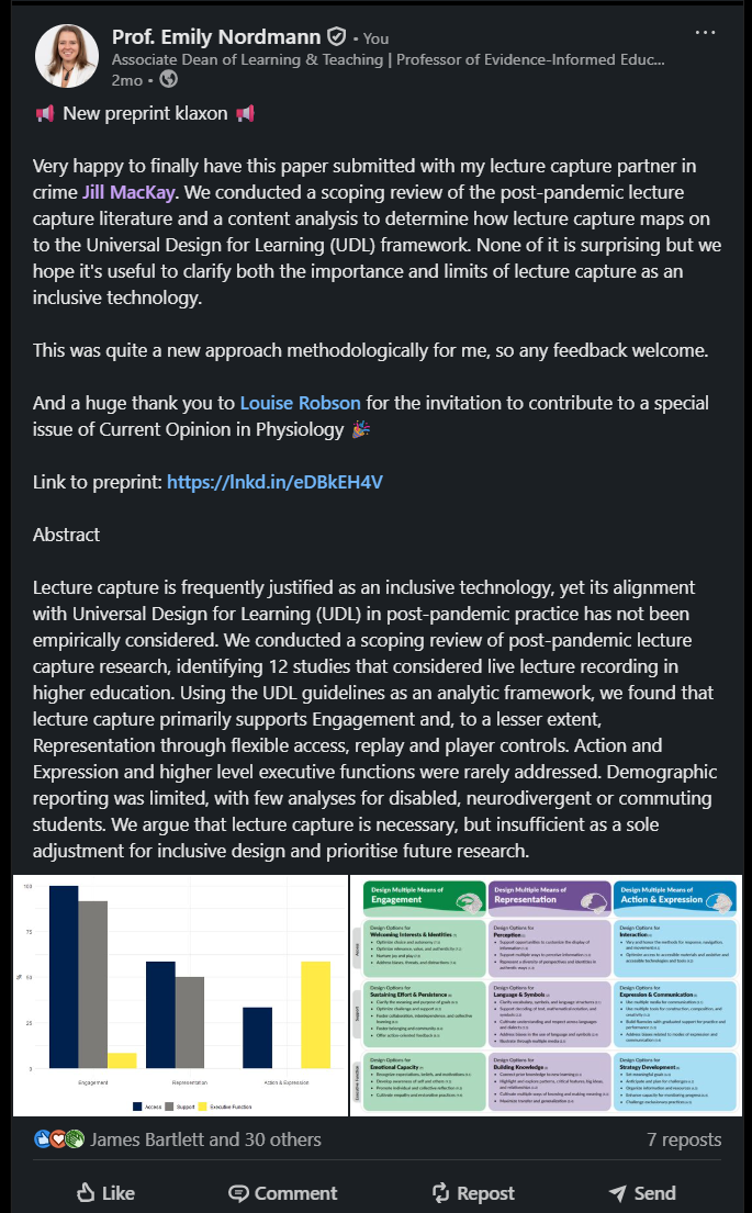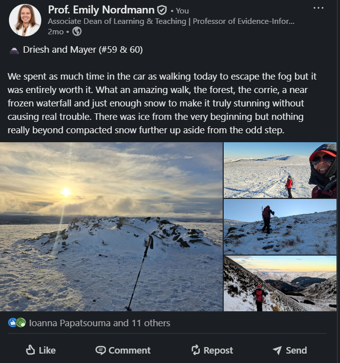 Industry analyses consistently identify mid-week posting (Tuesday to Thursday) as generating higher engagement on LinkedIn, with morning hours (7:00-9:00 AM) and lunch periods (12:00-1:00 PM) showing particular strength (Hootsuite, 2024). However, these represent aggregate patterns across millions of users, and your optimal posting time depends on when your specific network is active. For academics, consider institutional rhythms.Posts published during term time typically receive more engagement than those during holiday periods and posting in the early afternoon UK time often captures both European afternoon and North American morning activity.