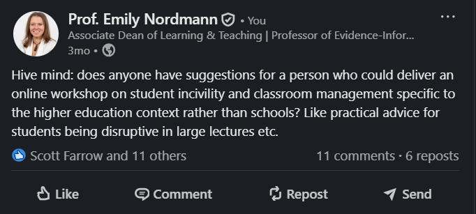 Asking questions can invite engagement and can also be a really useful way of getting information. Remember that specific questions get specific answers and vague questions (“Any tips for teaching?”) get vague answers.