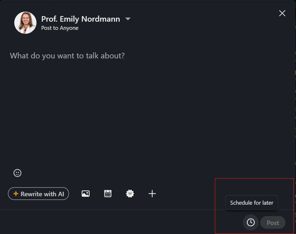To schedule posts, use LinkedIn’s native scheduling functionality by selecting the clock icon when creating a post, which allows you to compose content and select a future publication time directly within the platform.